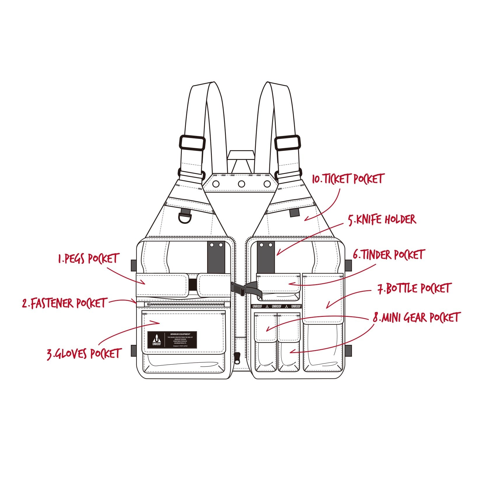 This camping vest doubles as a bag, focusing on practicality with pocket placement and size designed for tarp setup, campfires, and cooking.