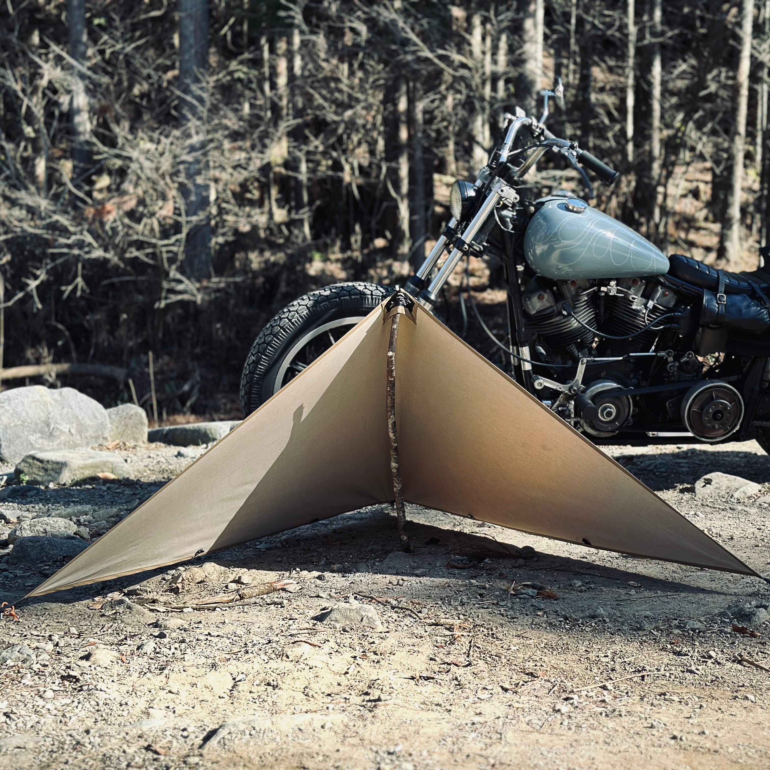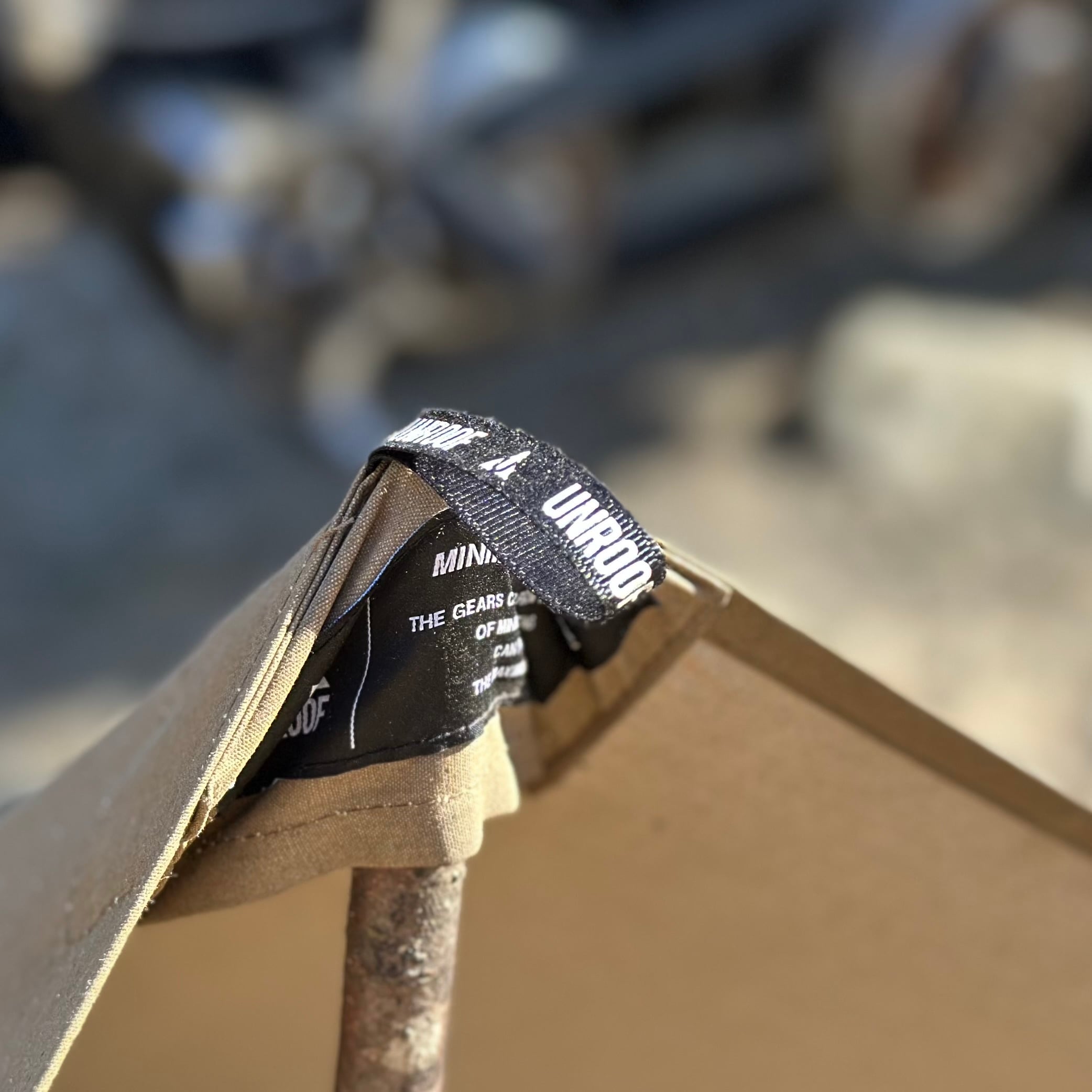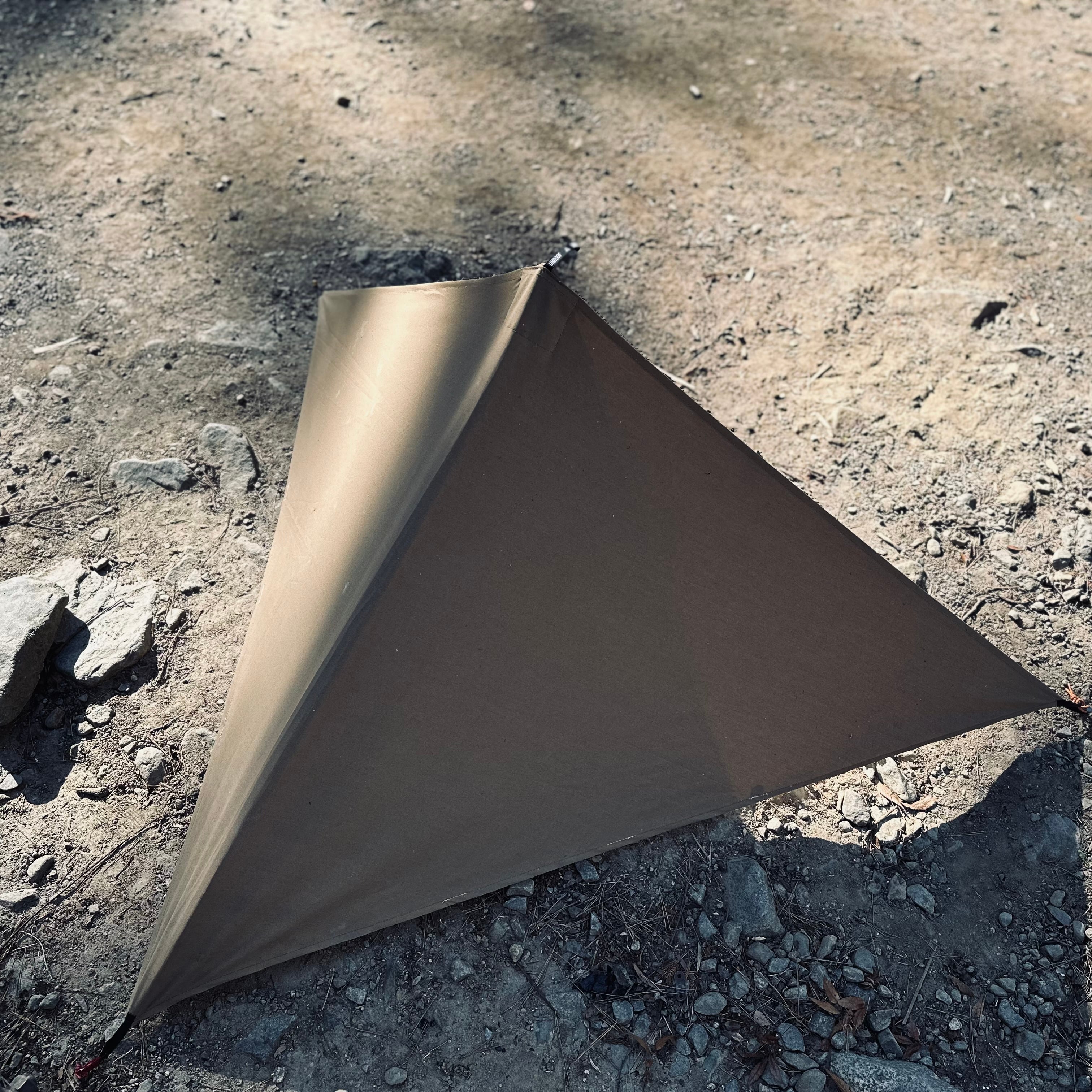 ペグ3本と現地調達した枝1本使用するだけのシンプル軽量な構造で設営の煩わしさがありません。枝が調達できない状況では頂点のロゴループを木やコードに吊るして設営することも可能です。