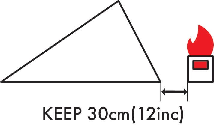 左右のペグダウンした直線上の地点から最低でも30cmの距離を保って焚き火台を配置してください。炎の真上にリフレクタープが来るような近すぎる配置ではリフレクタープに引火する恐れがあります。