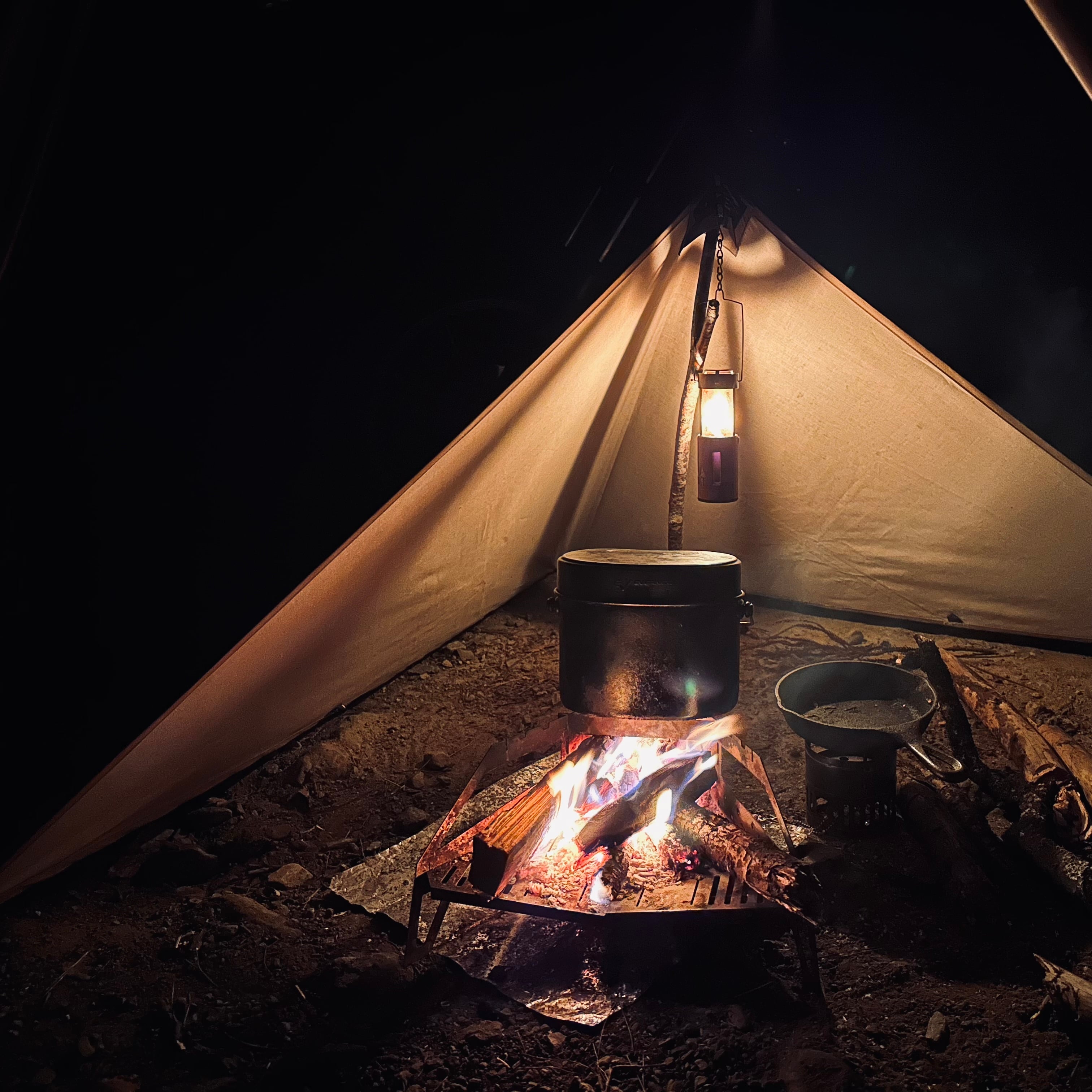 風や雨から焚き火を守る、タープタイプのソロリフレクター